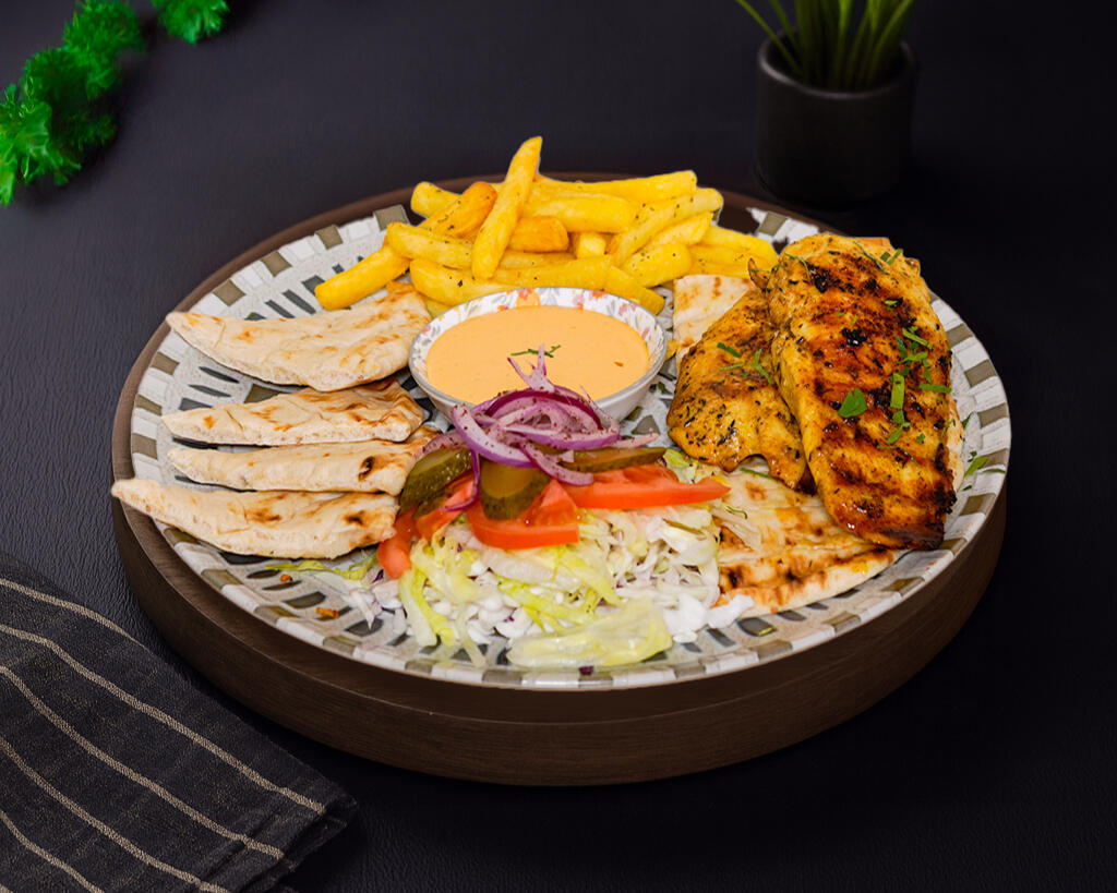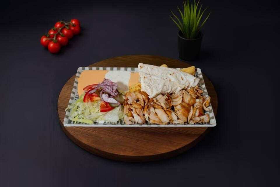 Chicken, flatbread, sauces of your choice, french fries, white cabbage, iceberg salad, tomatoes, pickled cucumbers, red onions. (450gr)