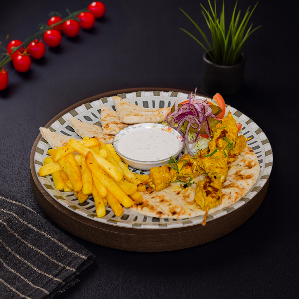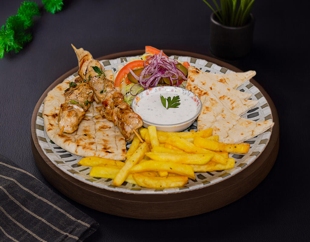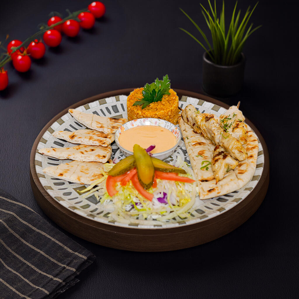 Chicken breast skewers marinated in yogurt and special spices, Greek pita/salad/potatoes or bulgur and a sauce of your choice. (450gr)