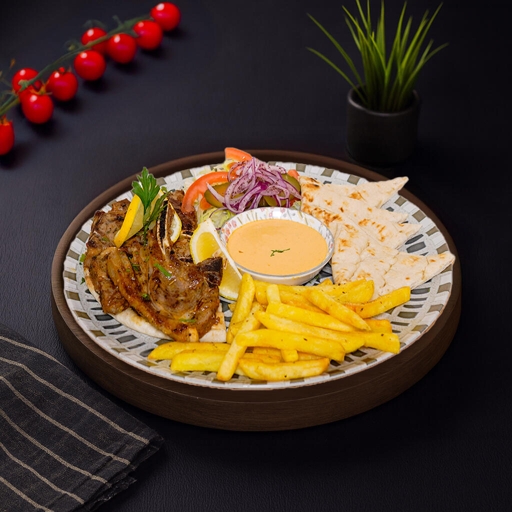 Marinated lamb chops, grilled, served with Greek pita/salad/potatoes or bulgur and a sauce of your choice. (400gr)
