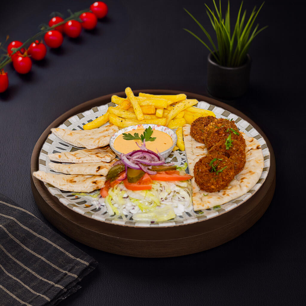 Chickpea meatballs mixed with oriental spices, Greek pita, sauces of your choice, fries, salad. (450gr)