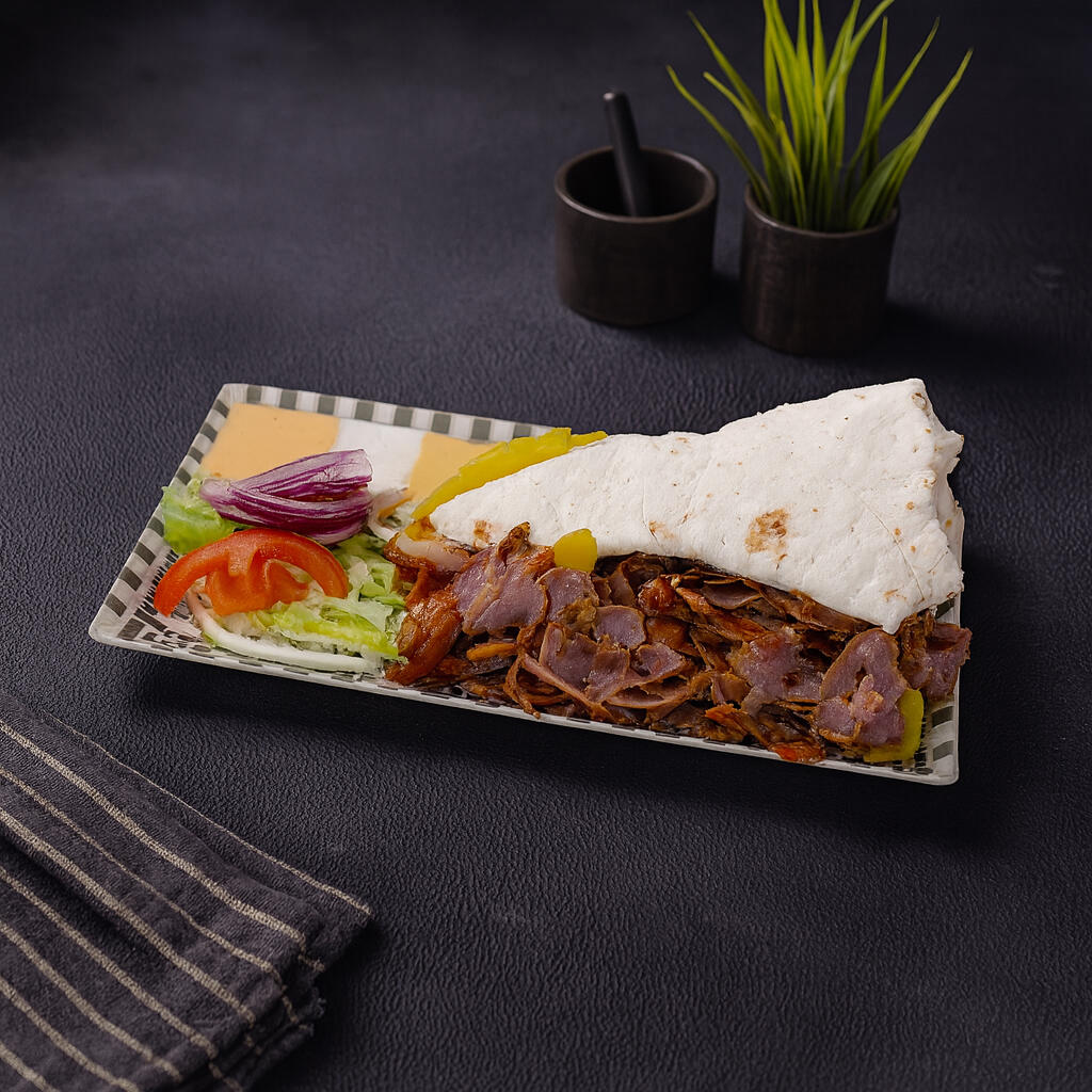 Beef-turkey, flatbread, sauces of your choice, french fries, white cabbage, iceberg lettuce, tomatoes, pickled cucumbers, red onions. (350gr)