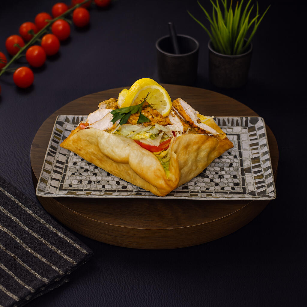 Chicken, flatbread, sauces of your choice, french fries, white cabbage, iceberg salad, tomatoes, pickled cucumbers, red onions. (550gr)