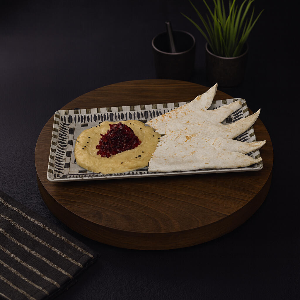 Chickpea paste blended with Middle Eastern spices, tahini, olive oil, served with flatbread.