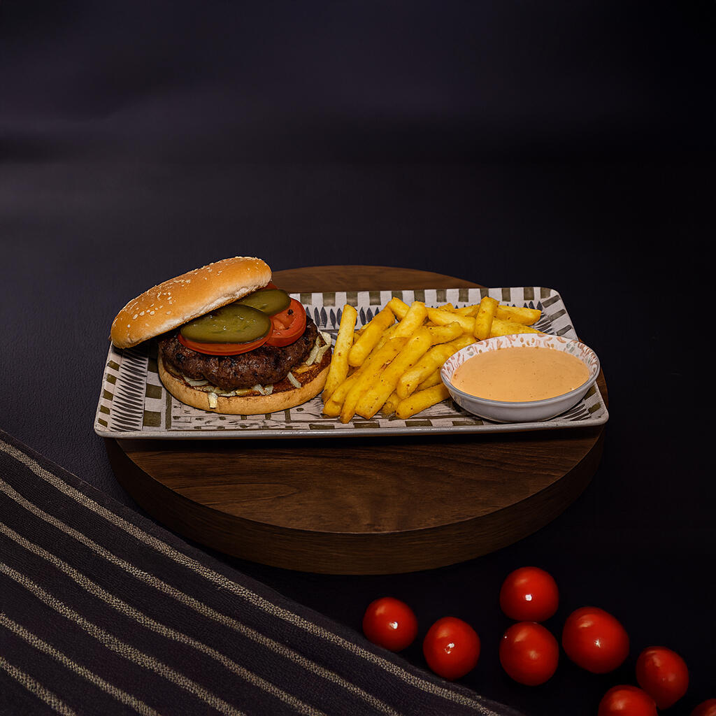 Grilled beef burger with an artisanal bun, lettuce, tomatoes, pickles, French fries, caramelized onions, and sauce of your choice. (450 g)