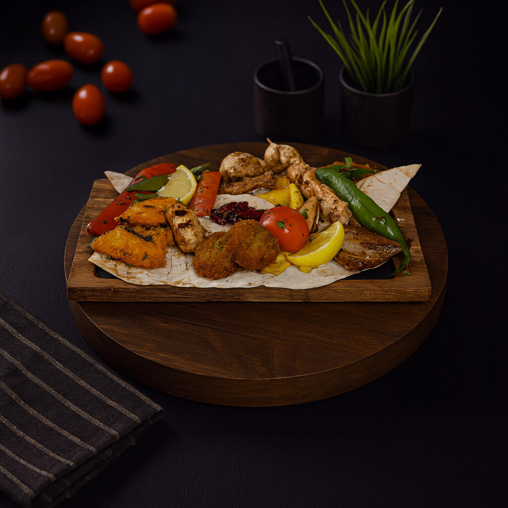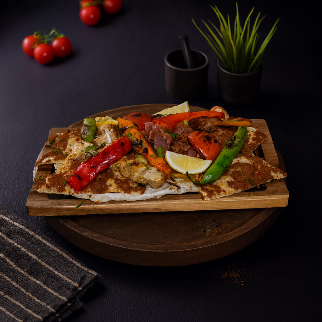 Classic Appetizer Mix: adana kebab, shish tavuk, piu piu kebab, shaorma meat, grilled vegetables, french fries, lahmacun and sauce. (1400gr)